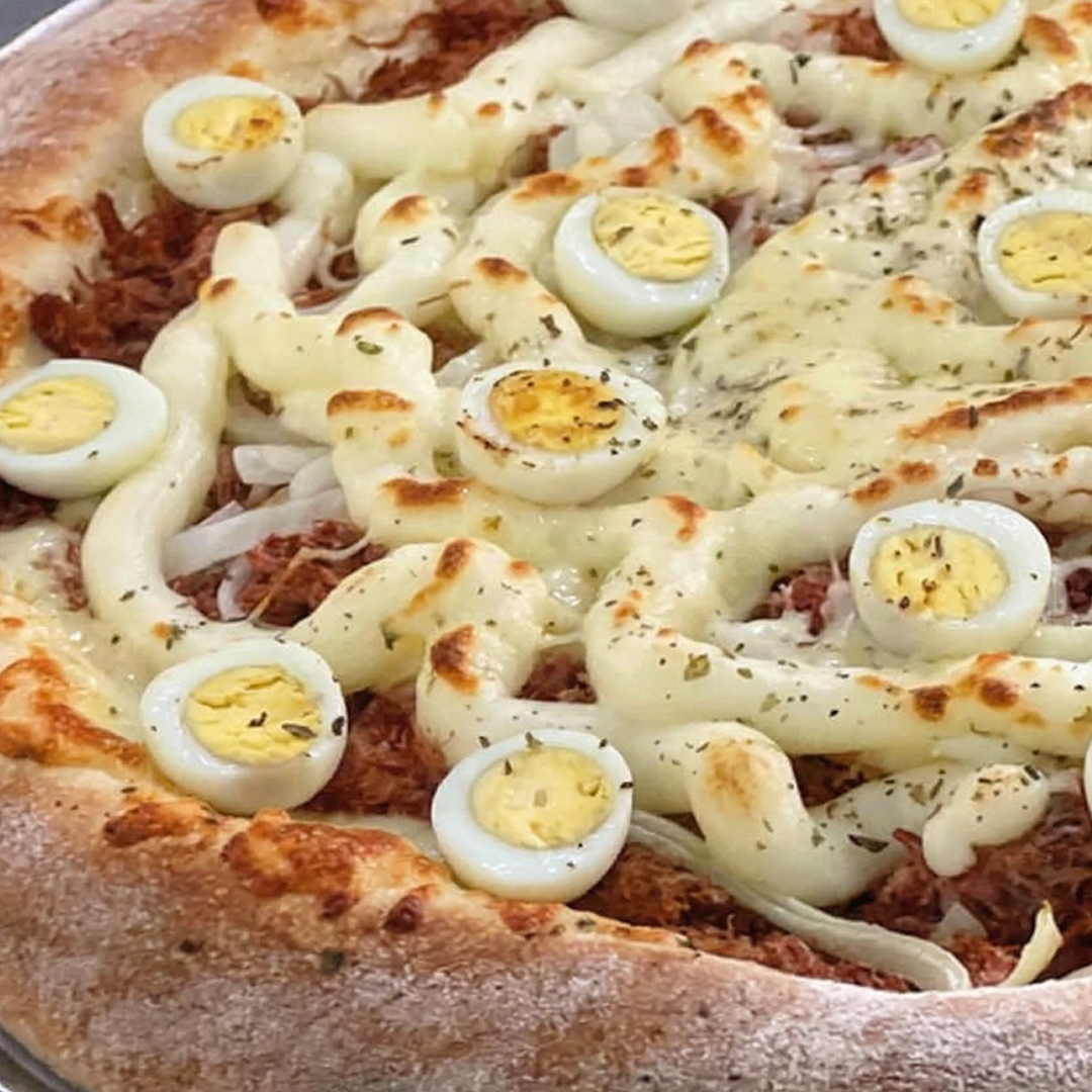 Carne Seca, Ovos de cordona, mussarela, milho azeitona e oregano